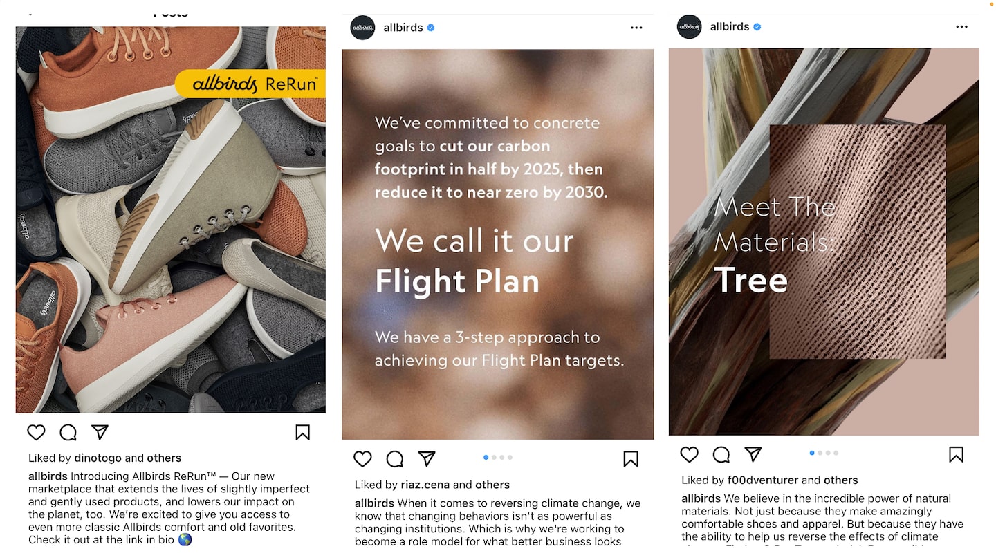 A frequent strategy that Allbirds uses in their storytelling is posting about how they’re implementing actions, not just words, in their quest for eco-friendly products. They share information on what materials are used in their products (in addition to where they’re sourced from). Furthermore, they promote campaigns that not only aim to build brand awareness but are constructed with the planet in mind. For example, their “ReRun” line encourages recycling products or buying gently-used ones. Additionally, Allbirds continuously posts about their Flight Plan that aims to fully eliminate their carbon footprint (literally) by 2030.