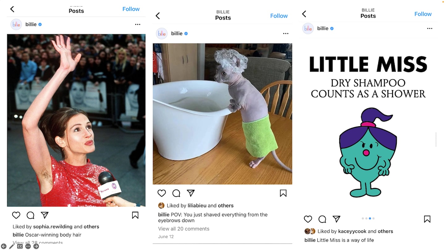 Although unrelated, there must be something in the name “Billie” that empowers people to shatter the “status quo” whether that be in music, or in this analysis, shaving norms. Billie, Inc. is less than a decade old, but has already molded a bold story for their brand that continues to be fostered through the content they post across their various company platforms.