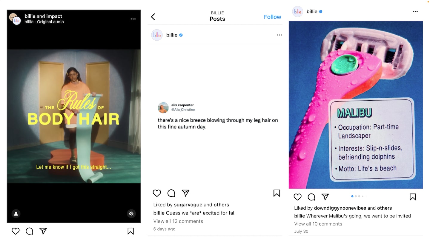 First, they frequently post cheeky content that honors both sides of the shaving spectrum, ranging from a repost that reads, “there’s a nice breeze blowing through my leg hair on this fine autumn day” to “bought my first billie razor and im literally bald all over.” And of course, there’s also the countless hysterical memes and videos you can scroll through on their feed. Using comedy as a main pillar of their brand storytelling approach helps them combat the backlash they might receive from challenging norms.