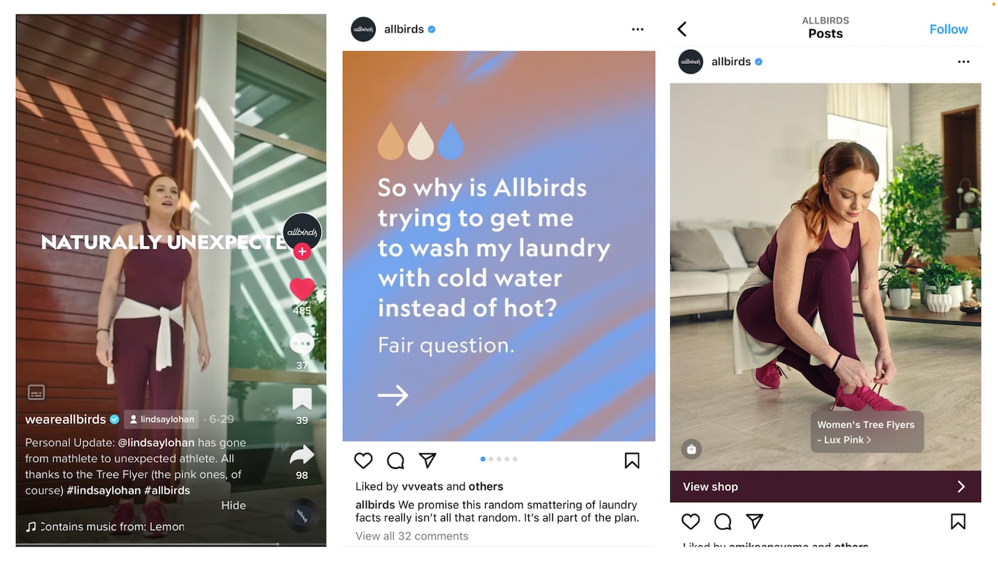 Another content campaign that Allbirds uses to further their brand narrative – and admittedly an incredibly entertaining one – is a collaboration with Lindsay Lohan in a piece called “Lindsay Lohan the Unexpected Athlete”. A witty campaign that seamlessly uses nostalgic aspects from her hit film Mean Girls, the video is saturated with genius jokes and puns in reference to Tina Fey’s work, such as Lohan cheekily saying to “always avoid the plastics” as she reaches for a pair of Allbirds shoes that are pink (because it’s Wednesday, of course).