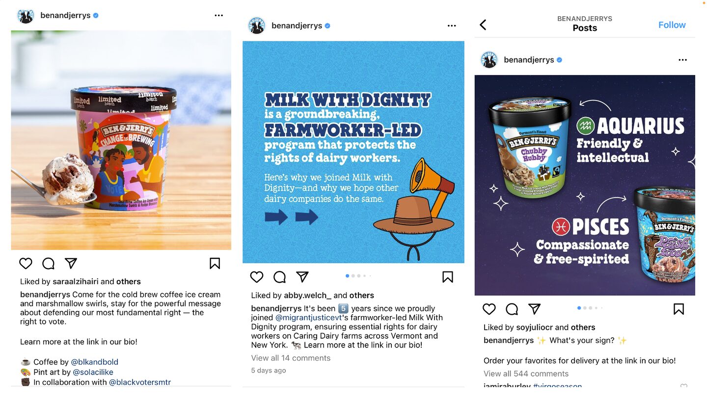However, where Ben & Jerry’s really shines is when they put their philanthropic missions front-and-center on their social channels (which they do frequently). This allows for a full circle understanding of how a “chill” ice cream brand is trying to influence not just their product market, but also righteous global issues. The company strives to not only carve their own brand story, but also put a positive spin on the world-at-large through their involvement with causes like voting rights, climate change, and racial equality.