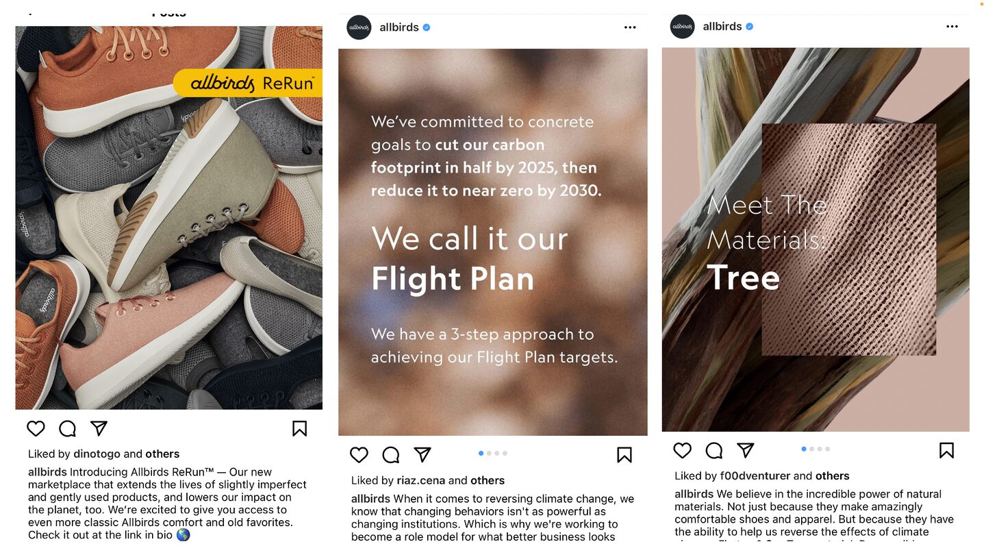 A frequent strategy that Allbirds uses in their storytelling is posting about how they’re implementing actions, not just words, in their quest for eco-friendly products. They share information on what materials are used in their products (in addition to where they’re sourced from). Furthermore, they promote campaigns that not only aim to build brand awareness but are constructed with the planet in mind. For example, their “ReRun” line encourages recycling products or buying gently-used ones. Additionally, Allbirds continuously posts about their Flight Plan that aims to fully eliminate their carbon footprint (literally) by 2030.