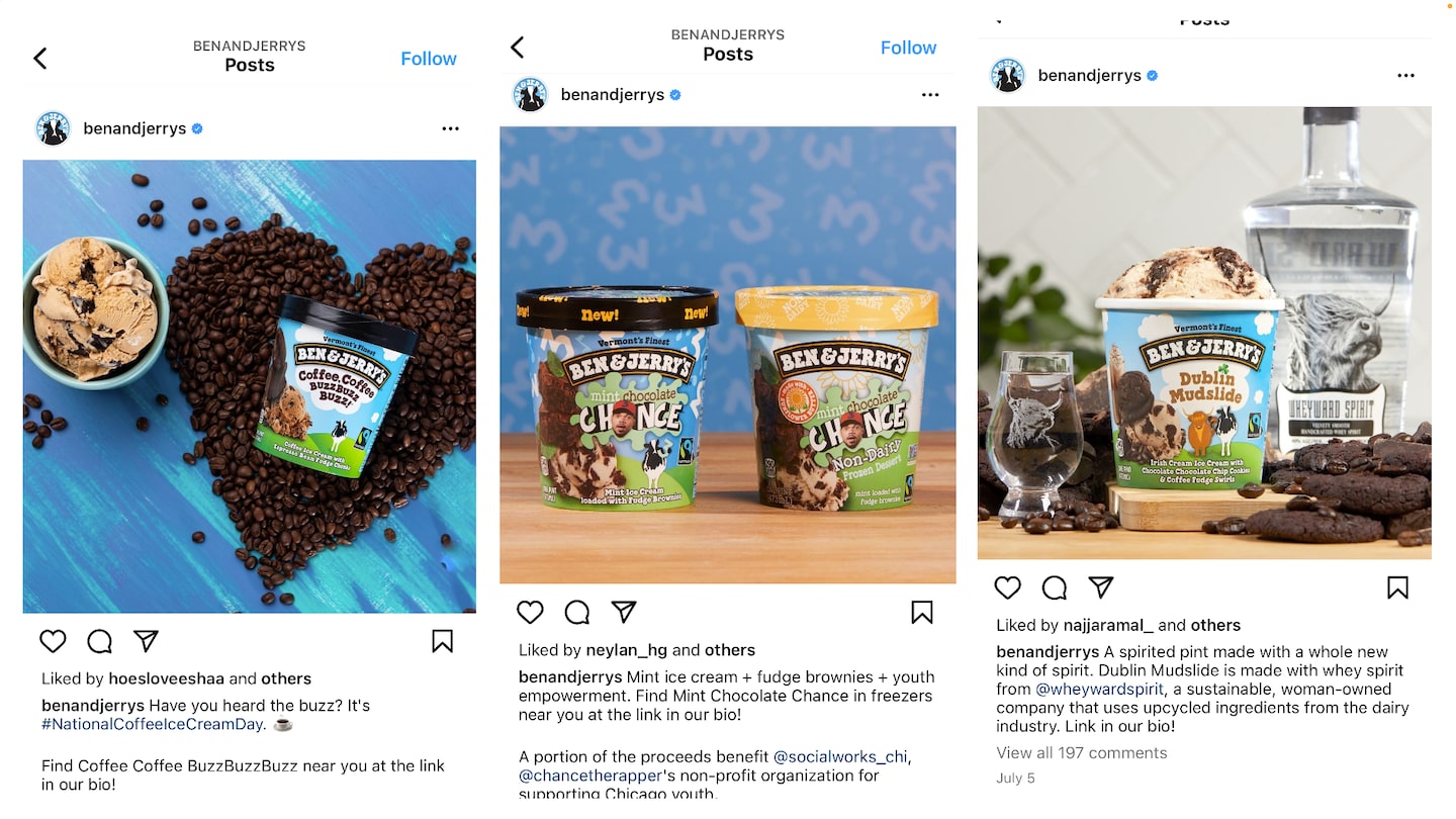 However, where Ben & Jerry’s really shines is when they put their philanthropic missions front-and-center on their social channels (which they do frequently). This allows for a full circle understanding of how a “chill” ice cream brand is trying to influence not just their product market, but also righteous global issues. The company strives to not only carve their own brand story, but also put a positive spin on the world-at-large through their involvement with causes like voting rights, climate change, and racial equality.