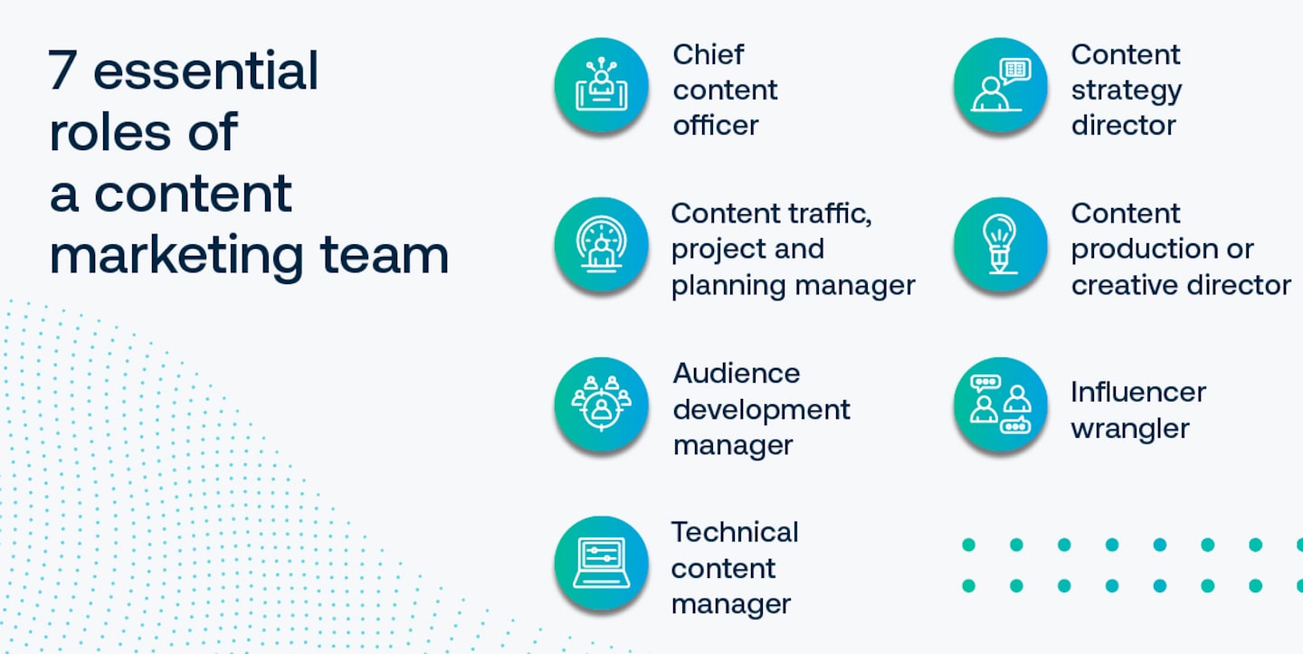 While the size and make-up of your own content marketing team is determined on your goals and budget resources, there are seven roles CMI has identified as being important to the function of content marketing within a business.