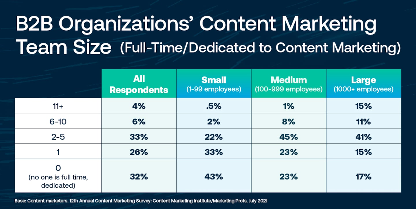 According to the Content Marketing Institute (CMI), 59% of B2B teams have five or fewer full-time workers who manage all the content responsibilities.