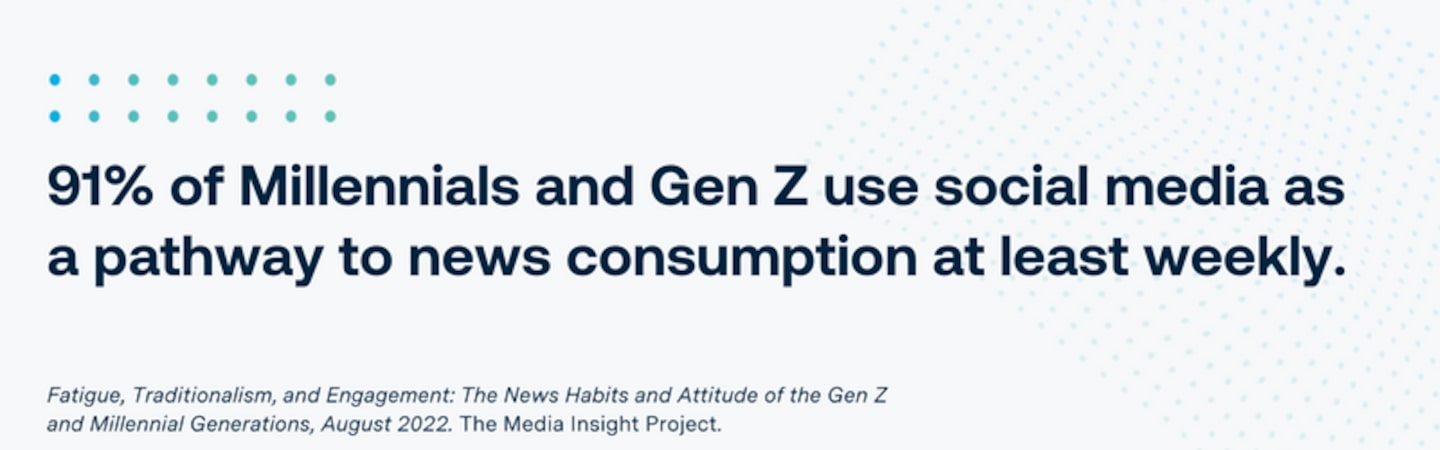 Research from The American Press Institute and the AP-NORC Center for Public Affairs Research on Millennials and Gen Z’s news habits and attitudes found that 91% of Millennials and Gen Z use social media as a pathway to news consumption at least weekly.