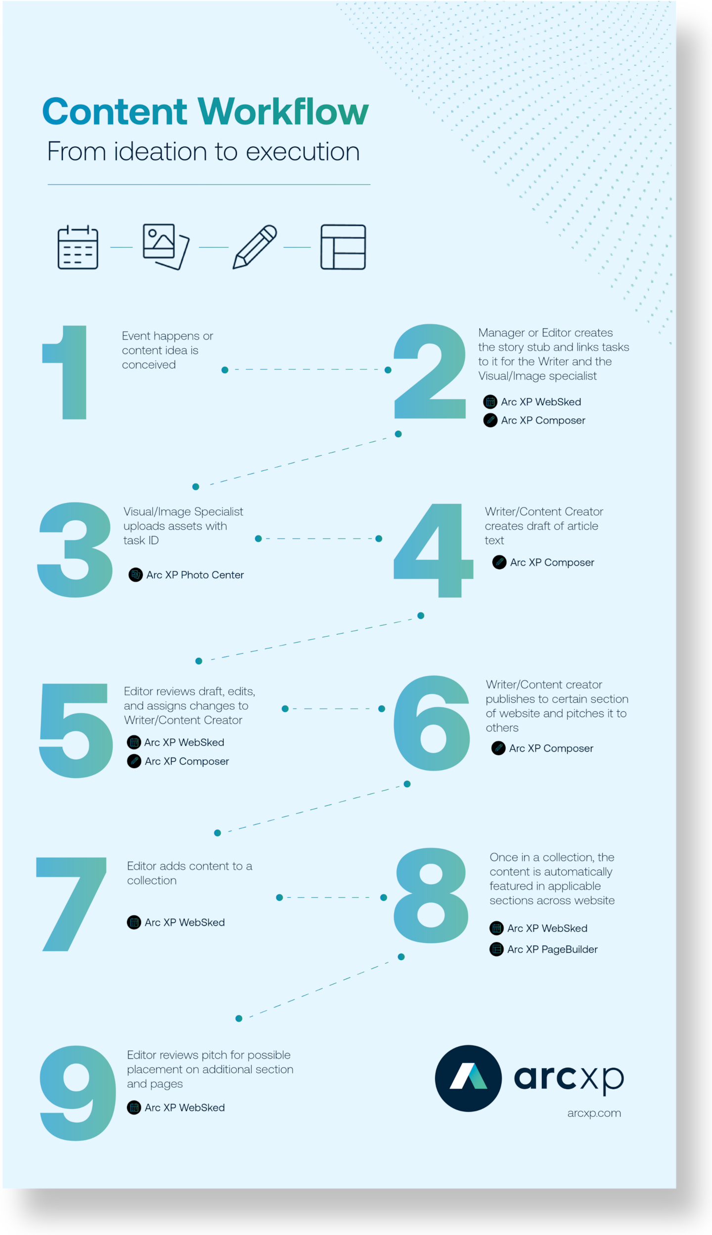 First, a workflow is “the sequence of steps involved in moving from the beginning to the end of a working process.” At Arc XP, we think it’s important to consider more than just the sequence of steps but to also have a shared understanding of the following: